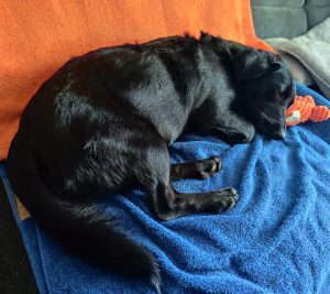 Nachts liegt er artig auf der Decke vor meiner Bettseite und schläft lange.