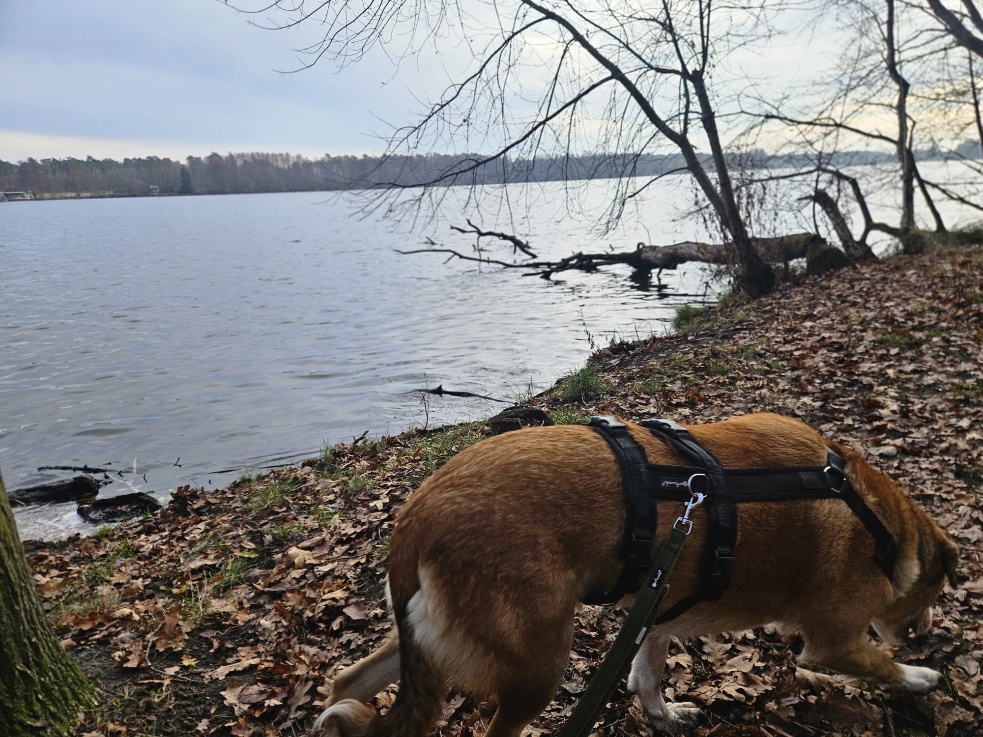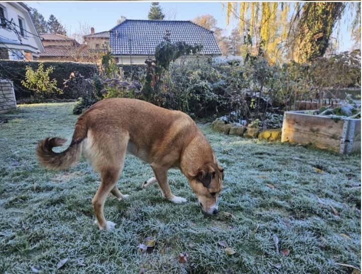 Man muss bedenken, dass Fonso mit seinen 3,5 Jahren aufgrund der Tatsache, dass er die gesamte Zeit im Zwinger eingesperrt war, so gut wie nichts kennt. Alles ist neu für ihn, erschreckt ihn, fordert ihn heraus. An Geschirr und Leine war er nicht gewohnt und wollte zunächst nicht einen einzigen Zentimeter vorwärts gehen. Das Geschirr kratzt und die Leine gängelt. Nach zwei Wochen hatte sich sein Stresspegel so weit gesenkt, dass wir den ersten Spaziergang außerhalb des Grundstücks unternehmen konnten. Naja, es war vielmehr ein Spazierenstehen als -gehen. Jeder Zentimeter wurde auf das Peinlichste genau beschnüffelt und untersucht. Jetzt nach zwei Wochen geht es schon etwas zügiger voran. Es wird mit jedem Tag besser.