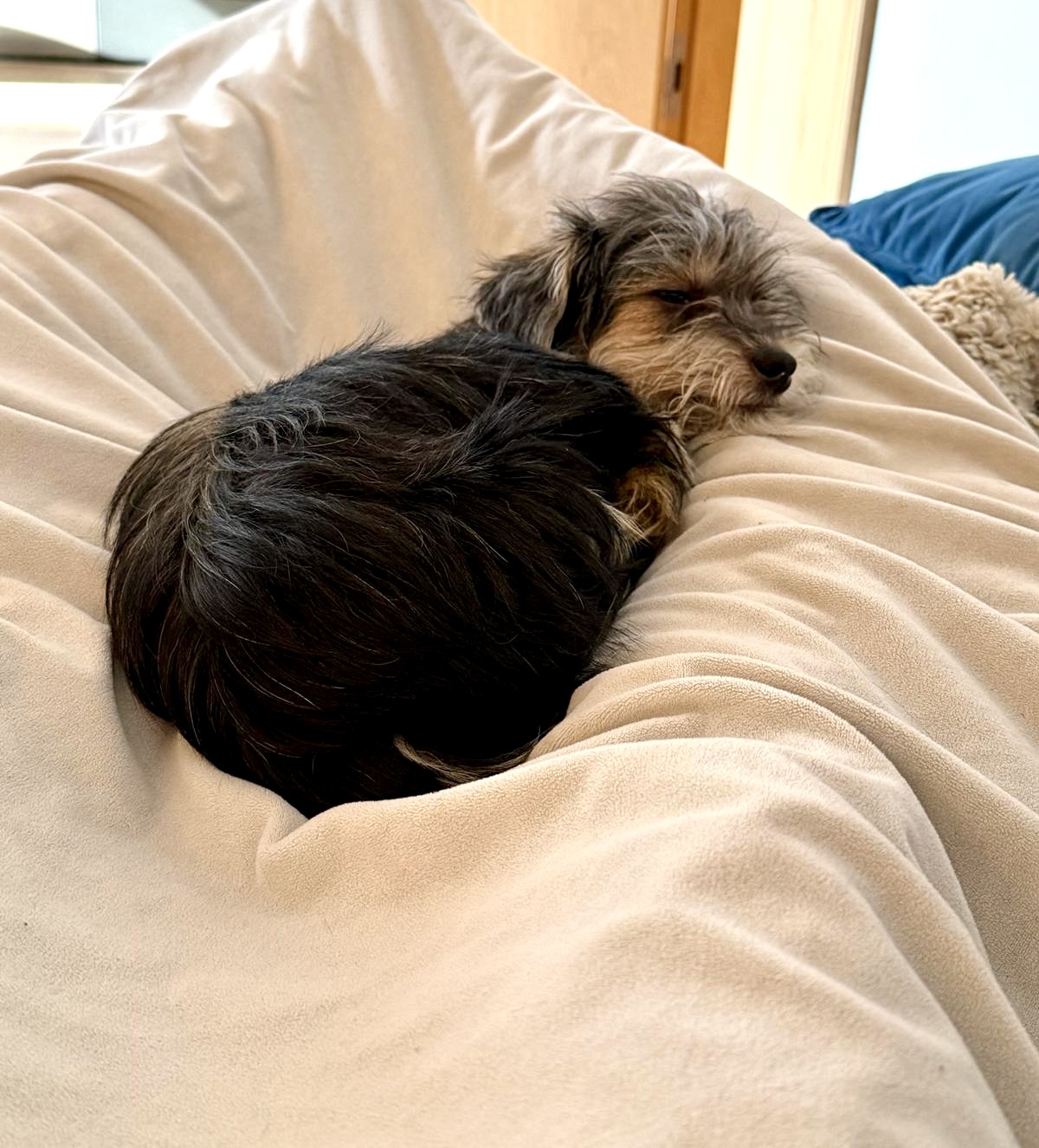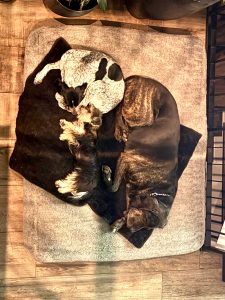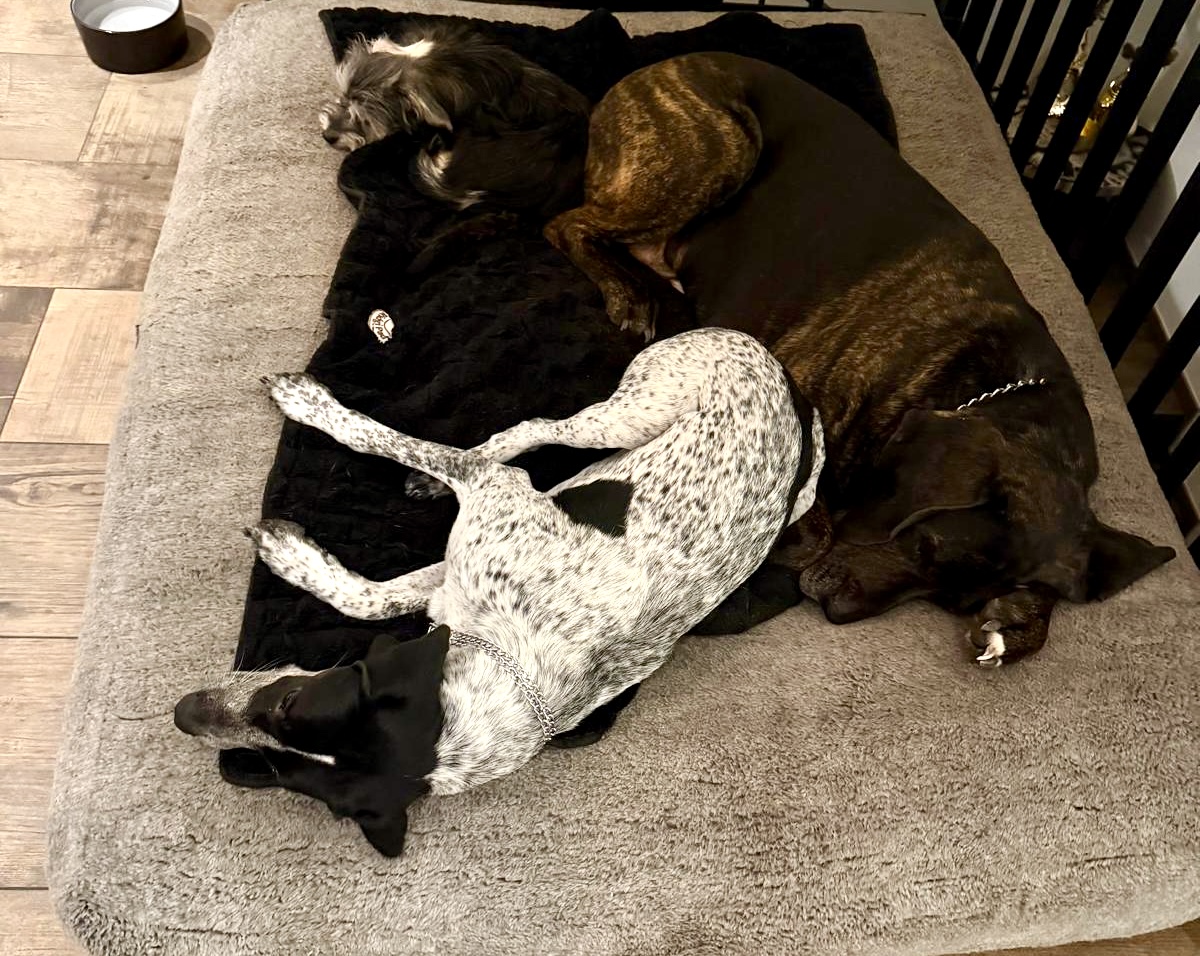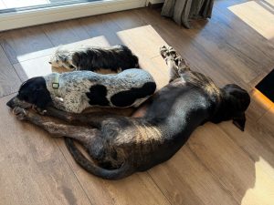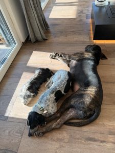 Daheim spielt er viel mit der Hündin und den großen Rüden himmelt er an.😆“