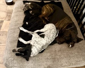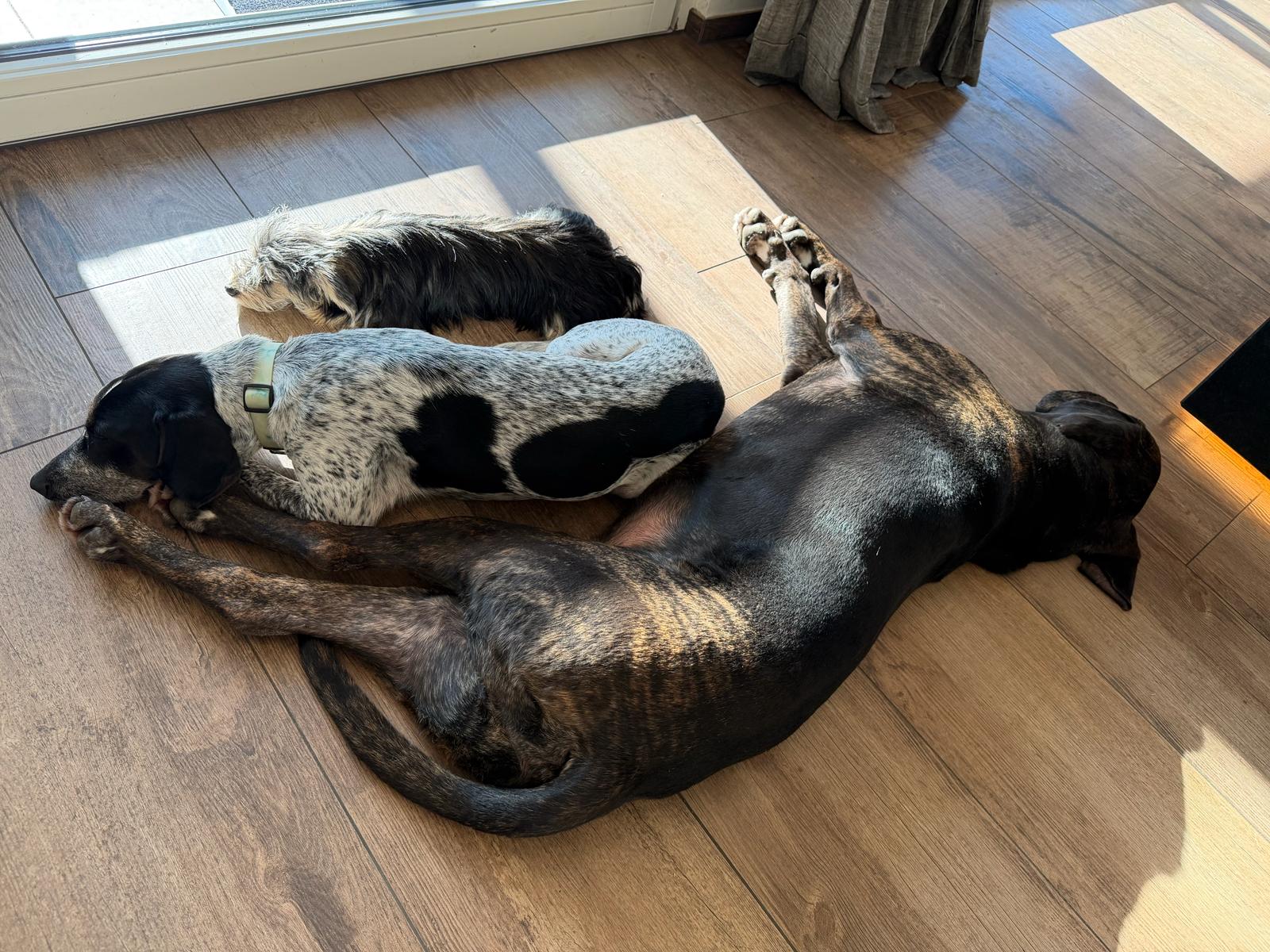 Die 4 (leider ist eine Hündin nach der Kastration verstorben) verstehen sich super. Benjamin ist in neuen Situationen etwas unsicher. Wir sehen ihn nicht in einem städtischen Umfeld.