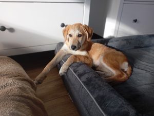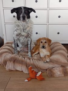 Sie hat eine alte Verletzung am Vorderbein was Emma aber in keinster Weise stört. Mit ihrer Hundefreundin Padma spielt sie sehr gerne, da merkt man nicht das sie ein krummes Bein hat ,sie ist genauso schnell unterwegs wie die anderen.