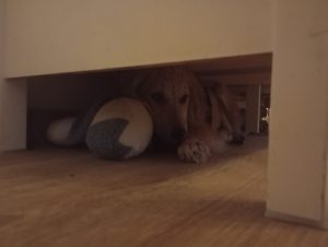Emma ist gut auf ihrer Pflegestelle in 57647 Alpenrod angekommen. Den ersten Tag hat sie sich unter dem Schrank versteckt.