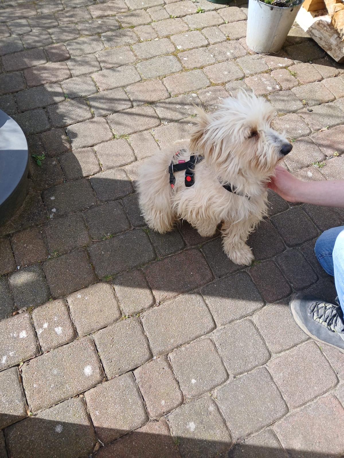 Flöckchen ist eine zarte Hundeseele. Sie schaut erstmal, ob man es gut mit ihr meint und geniesst dann auch die Aufmerksamkeit.