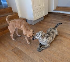 Auf der Pflegestelle lebt sie gut mit den vorhandenen Hunden (Rüden und Hündinnen) und Katzen zusammen.