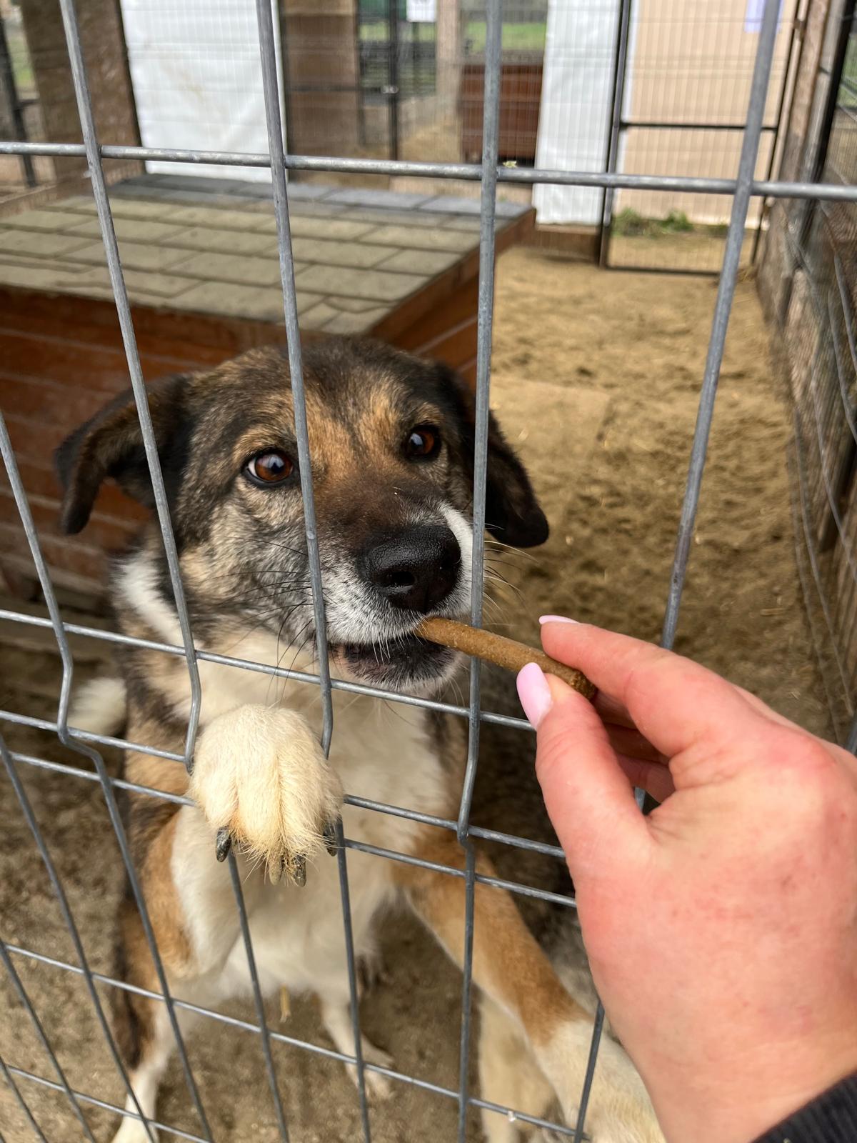 Julia hat sich in der neuen Umgebung weiter entwickelt. Sie kommt am Zaun sofort an und nimmt auch Leckerlies aus der Hand. Geht man in den Zwinger hält sie ein kleines bisschen mehr Abstand.