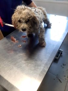 Der kleine Krümmel wurde verletzt und im schlechtem Zustand von der Tochter von Luiza nahe Craiova gefunden. Er wurde von einem großen Hund gebissen. Er kam zum Tierarzt und wurde versorgt.