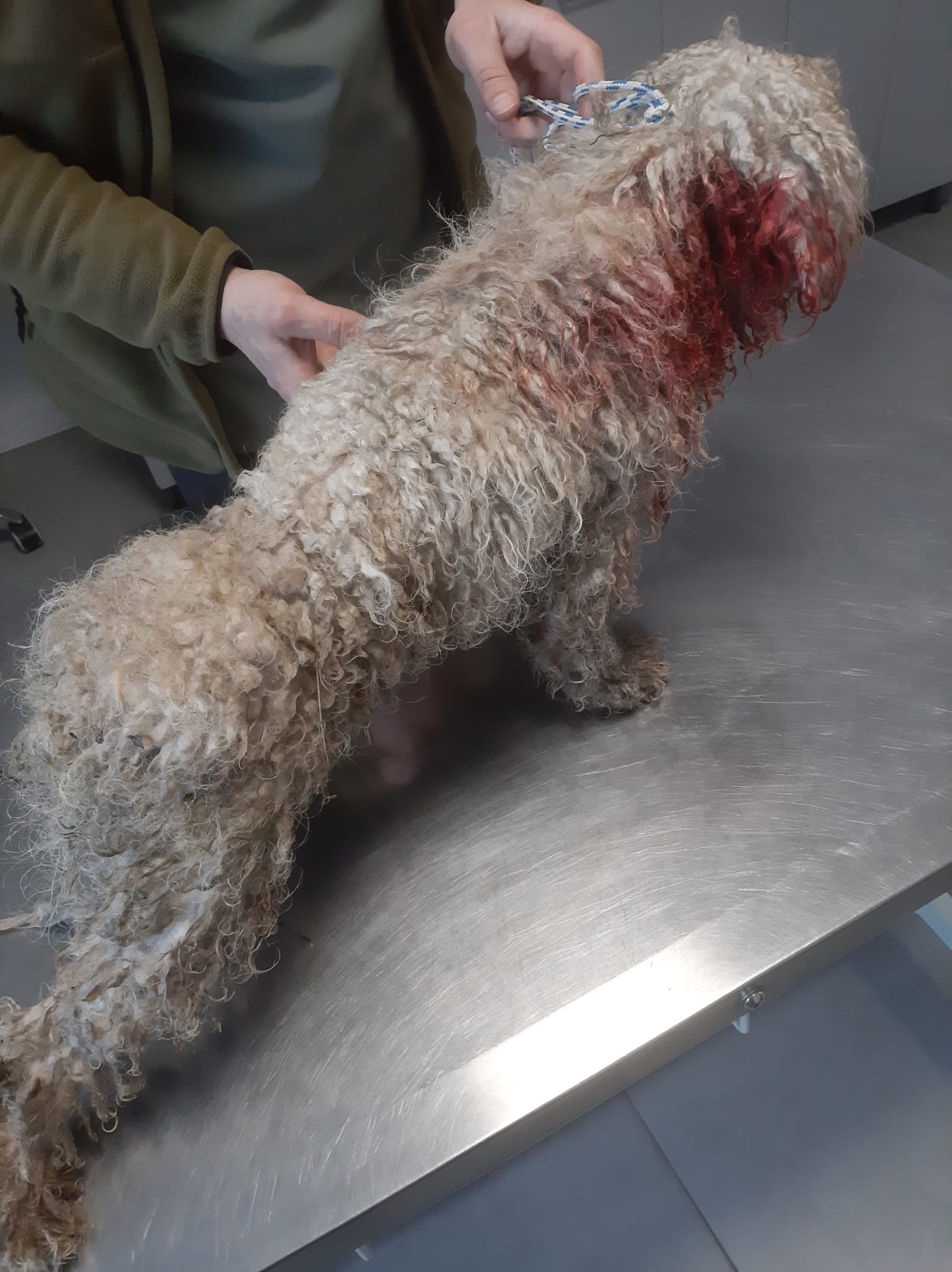 Der kleine Krümmel wurde verletzt und im schlechtem Zustand von der Tochter von Luiza nahe Craiova gefunden. Er wurde von einem großen Hund gebissen. Er kam zum Tierarzt und wurde versorgt.