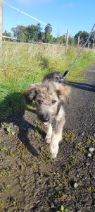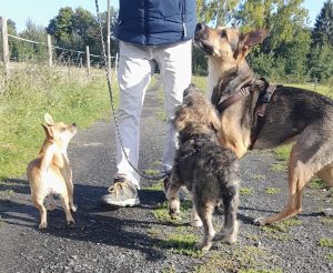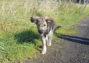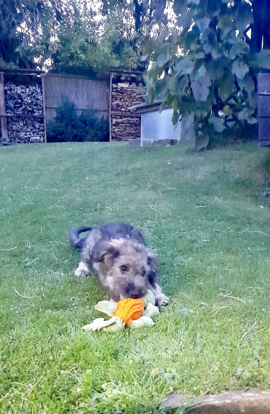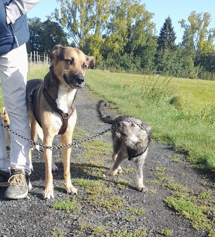 Spazieren geht er in Hunde Gesellschaft super gerne.Die Straße ängstigt ihn noch ziemlich.Deswegen sollte er eher in den ländlichen Raum ziehen.In der kurzen Zeit auf der Pflegestelle hat er schon gelernt sein Geschäft zuverlässig draussen zu verrichten.Im Auto verhält er sich ruhig und genießt dabei zu sein.Verschiedene Bodenbeläge meistert er mit Bravour und als Homeoffice Hund hat er sich auch schon bewährt.