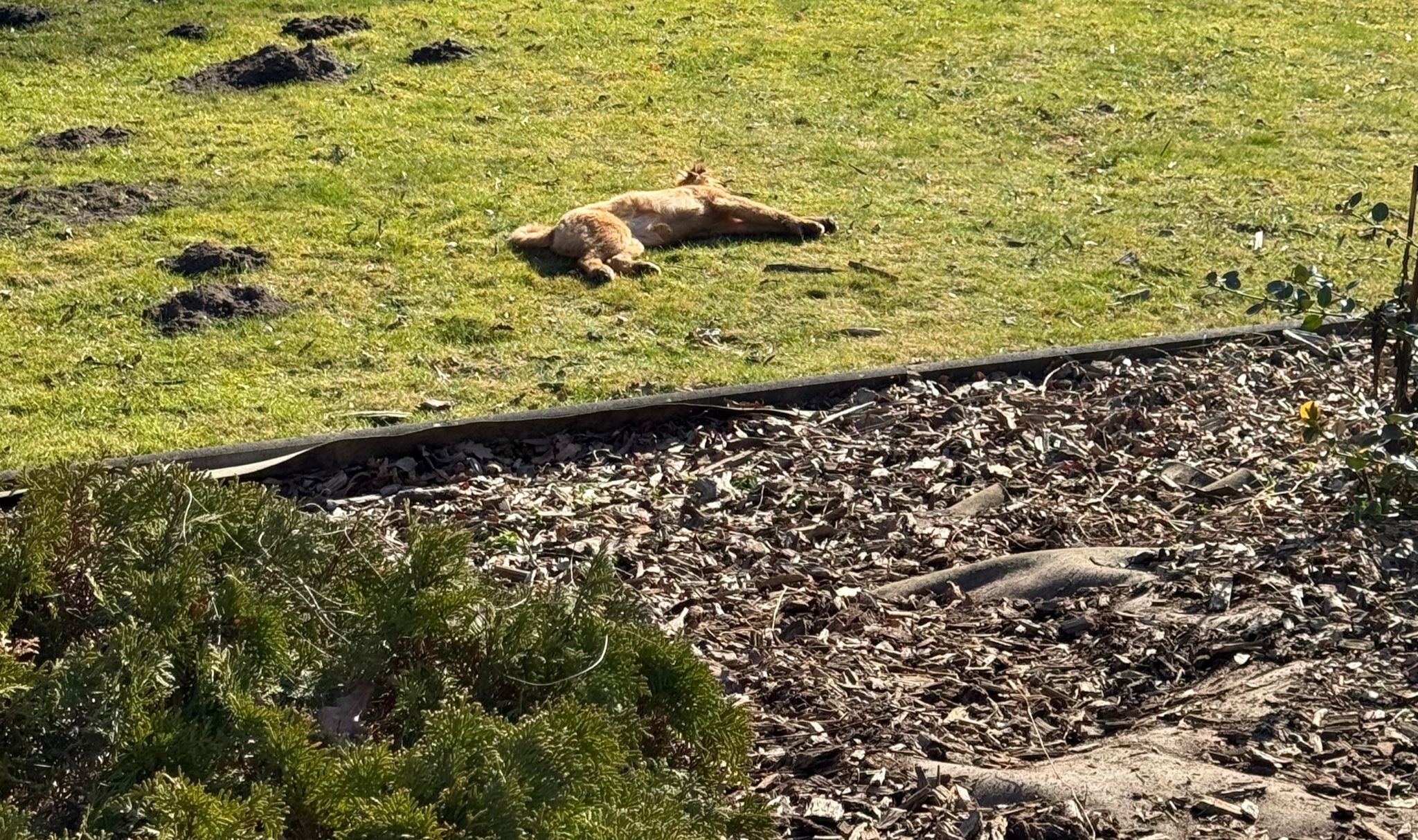 Ich liebe meinen neuen riesigen Garten in dem ich jedes Holzstück vernichte, welches ich finden kann. Wenn ich meine fünf Minuten habe, pflüge ich Herrchen seine Beete und Rasen kurz um, bevor ich ein Schläfchen mache.