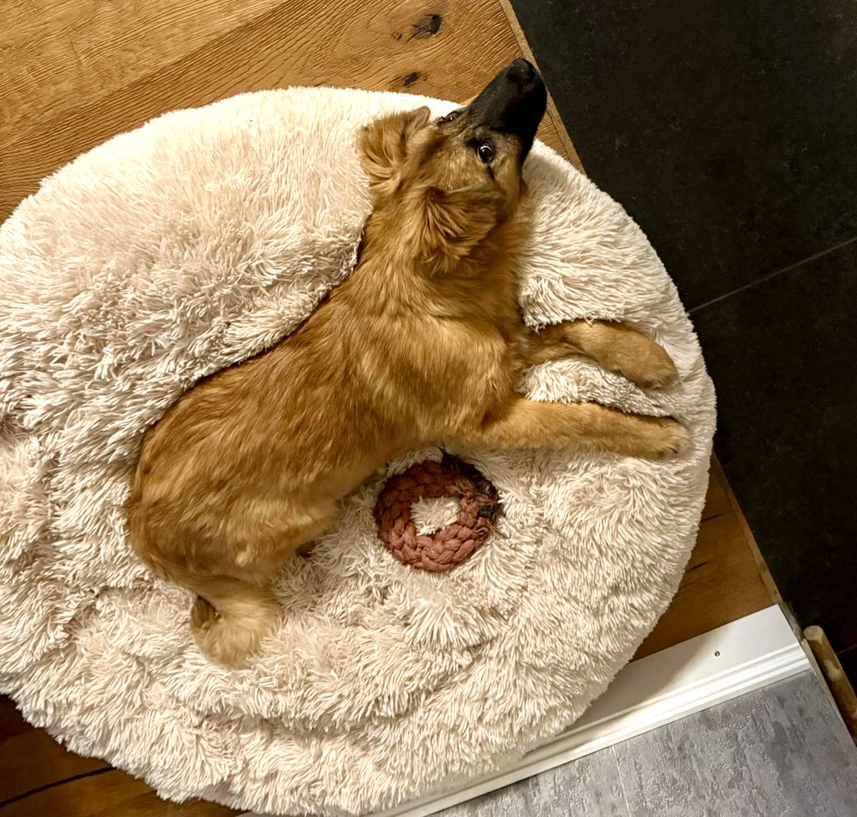 Ich fühlte mich vom ersten Tag an wohl und habe endlich Menschen gefunden, die genau so gerne schmusen wie ich! Wenn ich nicht gerade schlafe, kaue ich auf meinem Seil oder ärgere meinen Menschenbruder Sean.