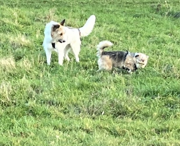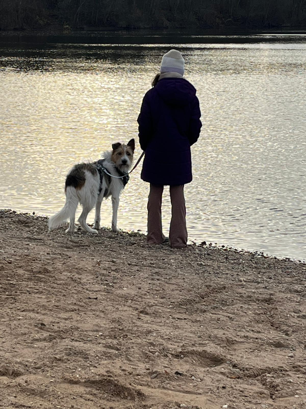 Du genießt die schönen Spaziergänge und freust dich, wenn ihr andere Fellnasen trefft und du mit ihnen spielen kannst.
