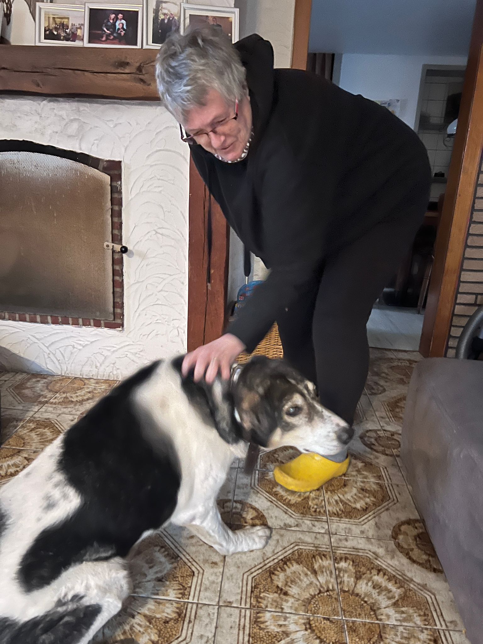 Moshu hört und sieht nicht mehr so gut und sein eines Vorderbein ist steif. Er ist im Tierheim sehr lieb zu uns Menschen und kommt auch gut mit den anderen Hunden aus.