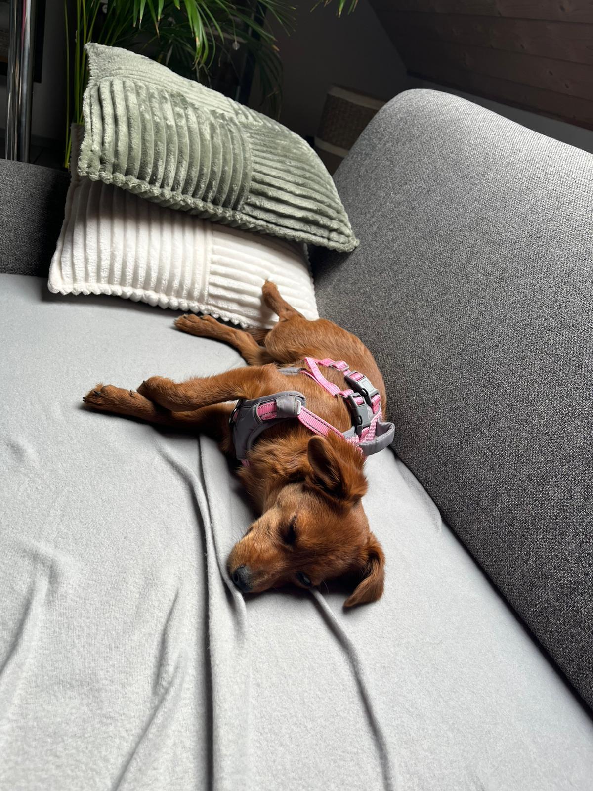 Sie hat bereits verstanden, sich zu melden, wenn sie raus muss – daher wird sie sicher bald ganz stubenrein. Leine und Geschirr lernt sie gerade kennen und freundet sich langsam damit an. Mit etwas Geduld und liebevoller Begleitung wird sie schnell Fortschritte machen.