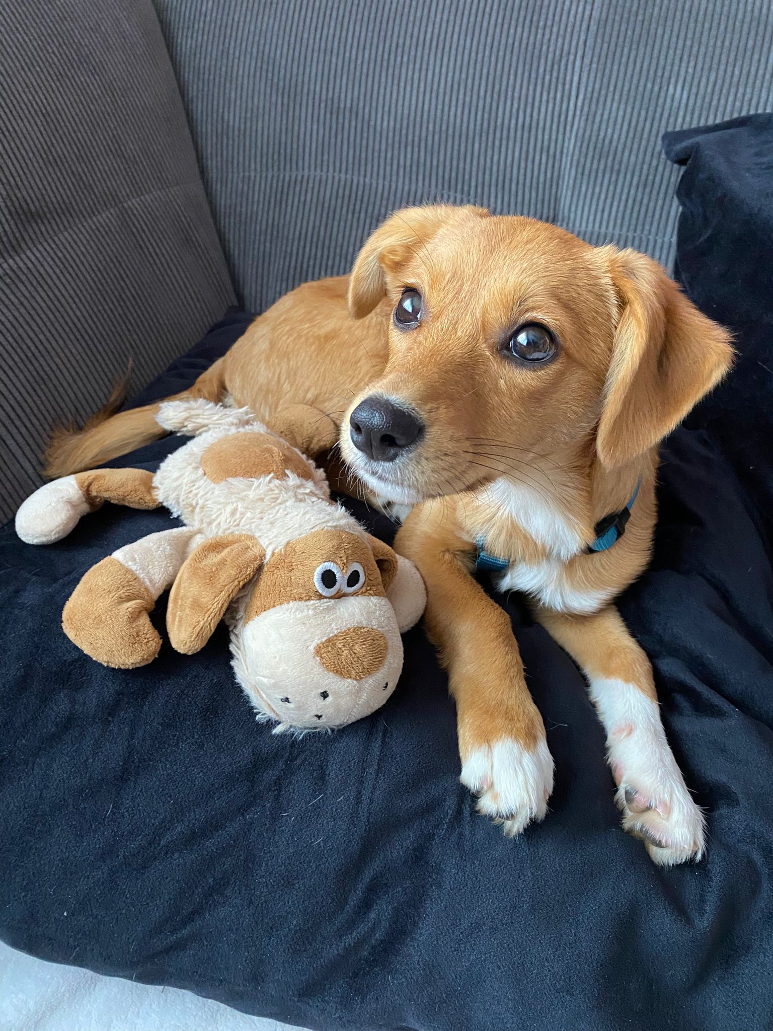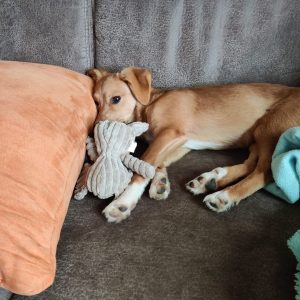 Ich spüre, dass mein Frauchen immer für mich da ist. Wir kuscheln viel zusammen und ich fühle mich dabei richtig geborgen. Wir fangen langsam an zu spielen, und ich lerne jeden Tag etwas Neues. Ich verstehe schon richtig viel und entdecke jeden Tag ein bisschen mehr von der Welt. Gemeinsame Gassirunden mit Toffee und Paula machen mir besonders viel Freude.