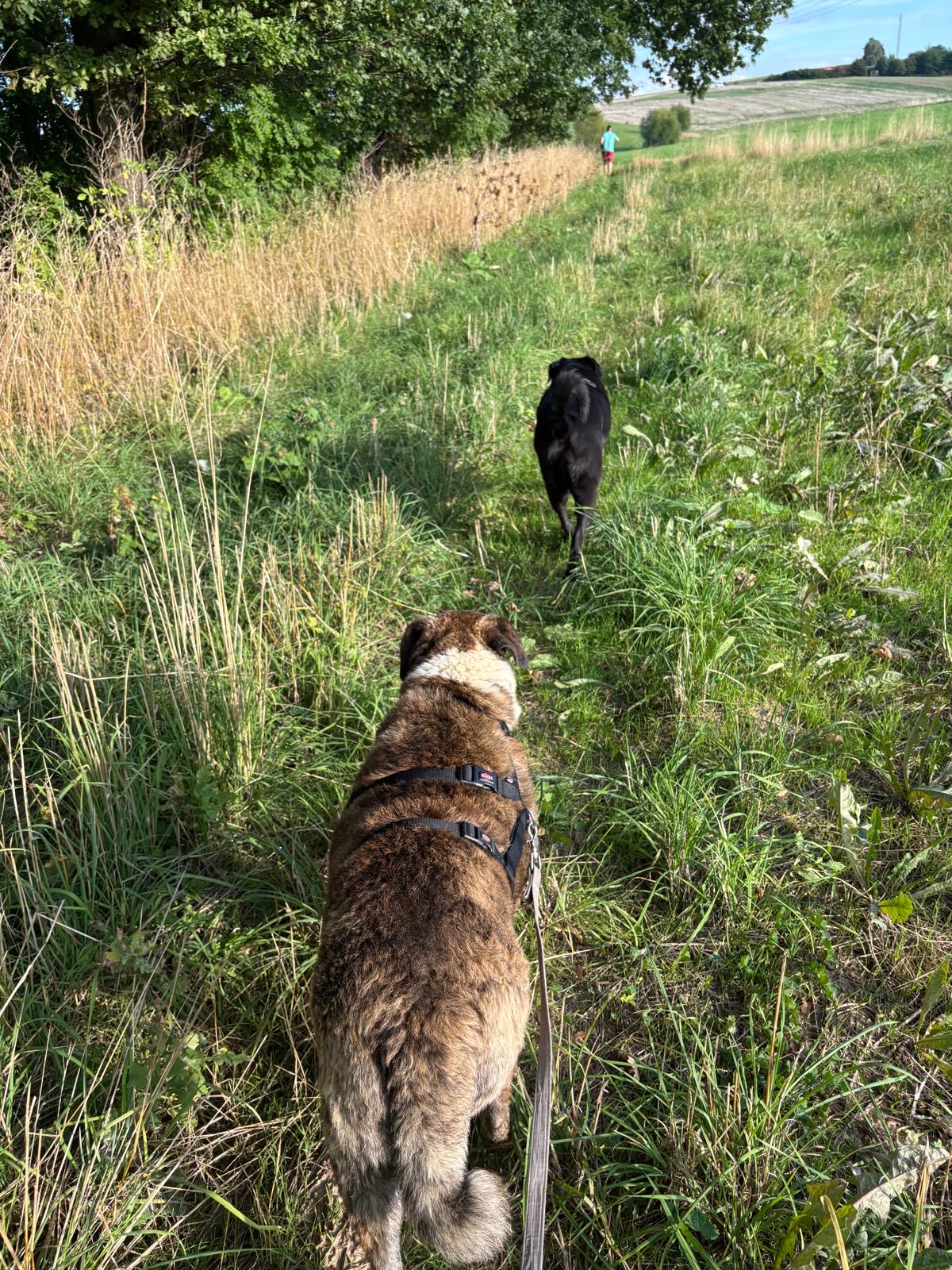 Er schaut sich viel von Tinny ab und das Spazierengehen wir immer besser. Es geht einem das Herz auf, die beiden so zu sehen, wenn sie sich beschnuppern und nebeneinander im Gras laufen.