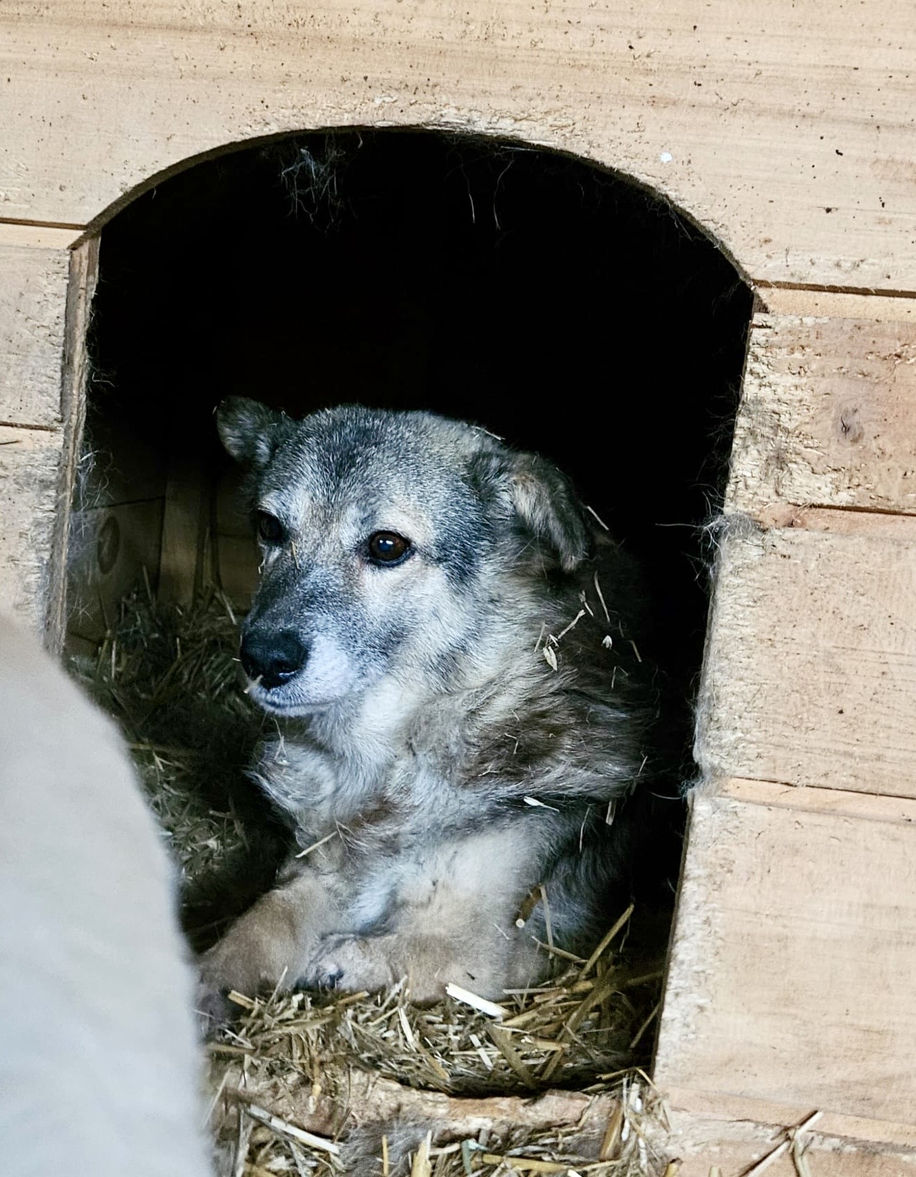 Wir wurden angefragt, ob wir helfen können. Wir sagten der Gruppe zu und so kamen alle, auch Stacy, zu uns. Stacy zeigt sich im Tierheim als sehr verträglich mit den anderen Hunden und sie mag auch den Arbeiter gerne.