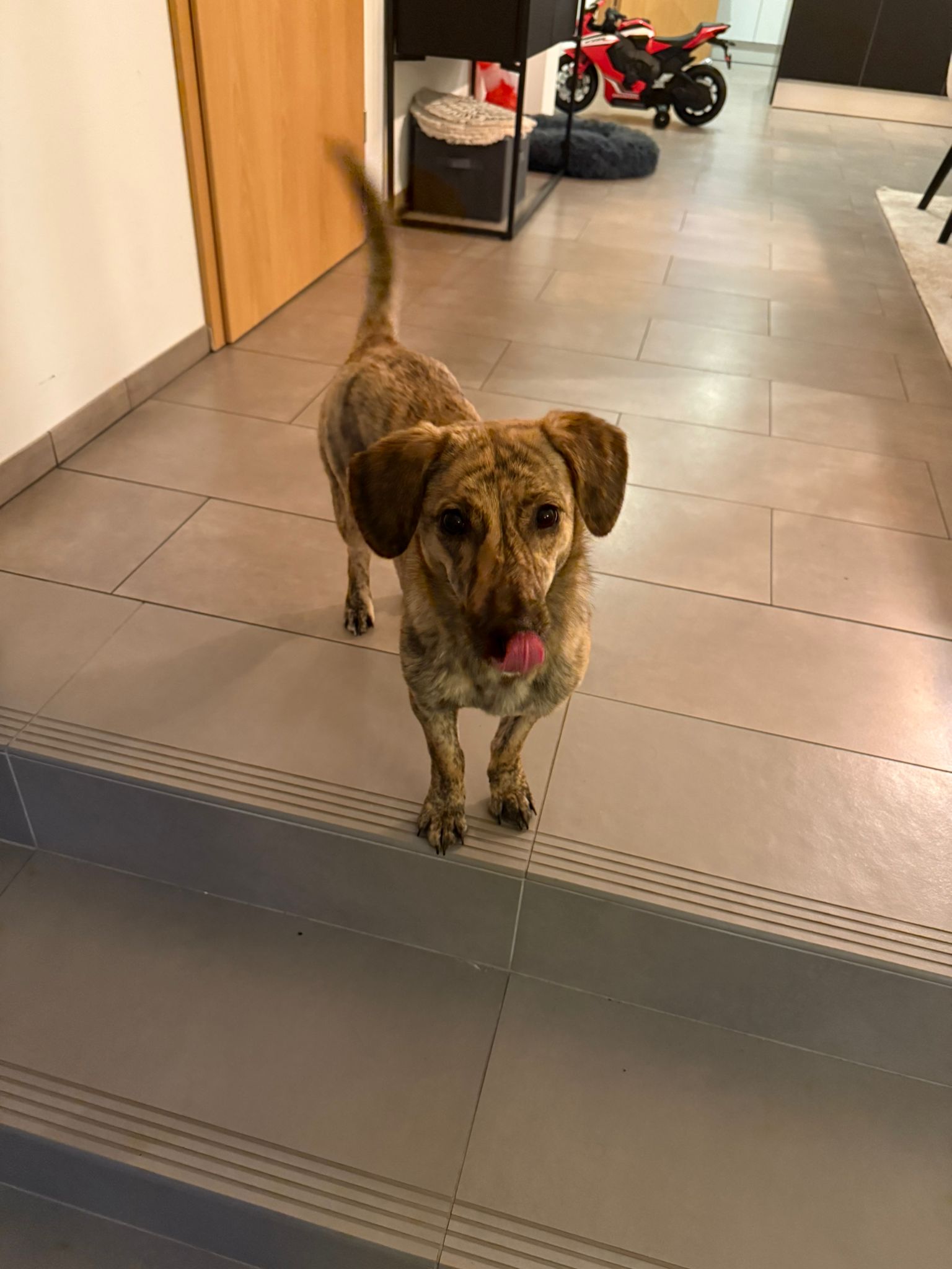 „Tinka ist gut in unserer Familie angekommen und bereichert unseren Alltag jeden Tag aufs Neue. Sie ist ein aufgeweckter, fröhlicher und sehr verspielter Hund, der uns oft zum Lachen bringt. Nach und nach lernt sie, dass auch ein kleiner Wirbelwind mal eine Pause braucht, und nimmt ihre Ruhephasen immer besser an.