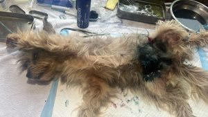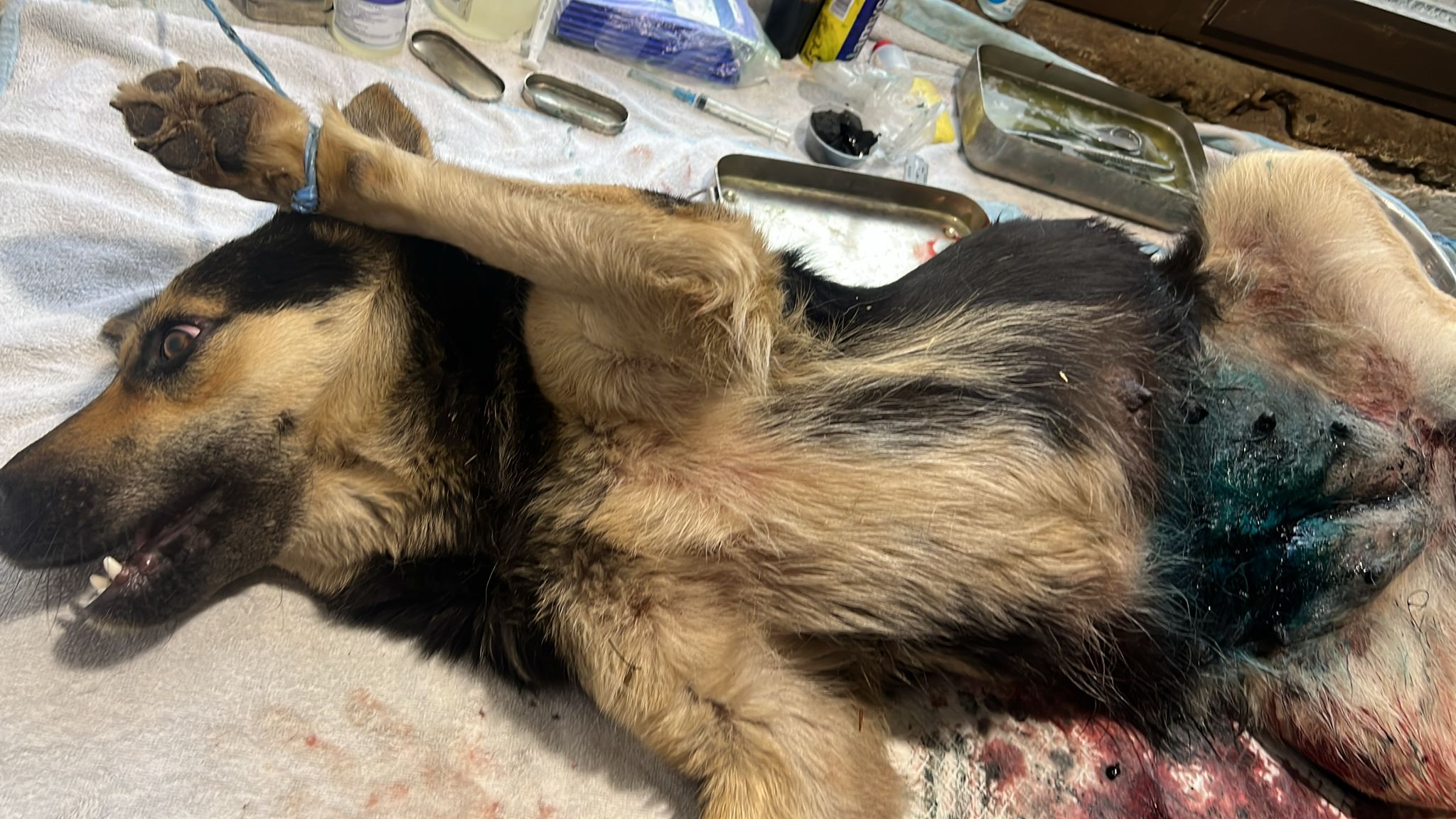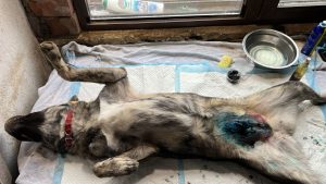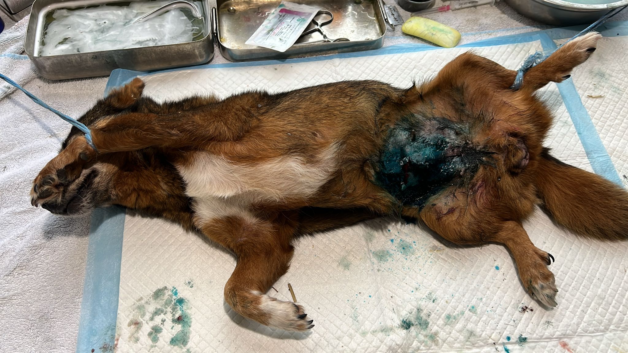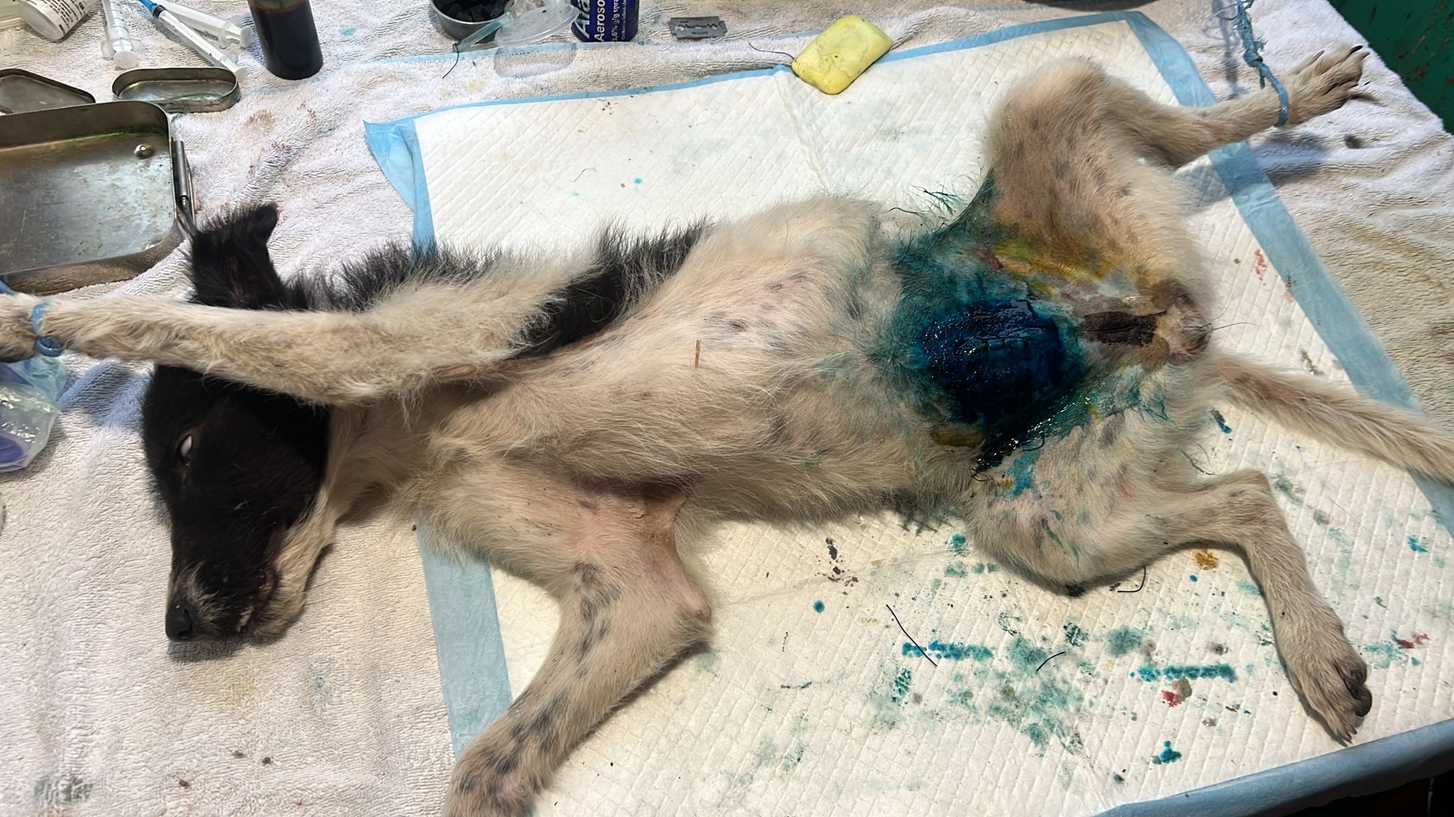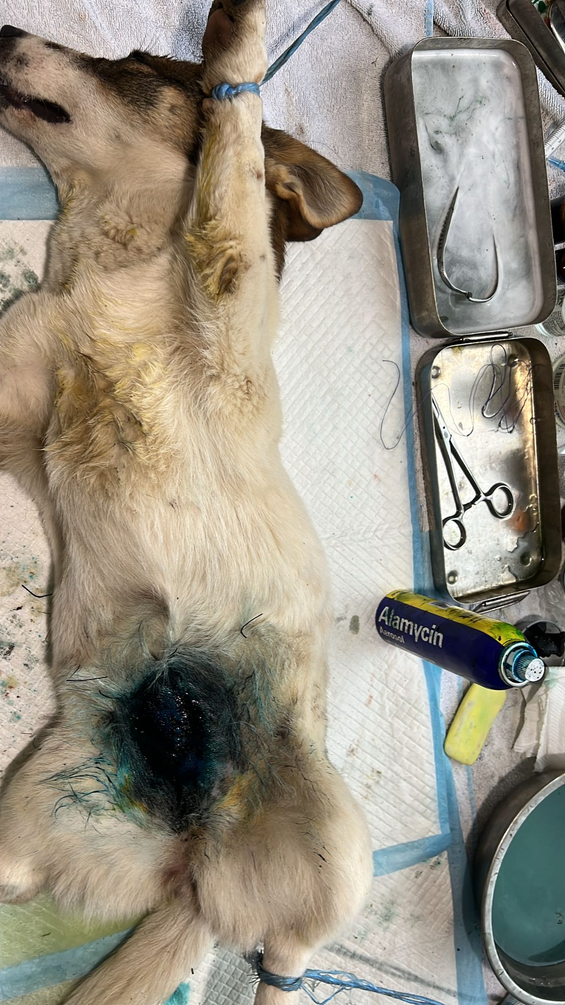 Auch diese scheue Hündin konnten wir einfangen. Sie hatte einen eingewachsenen Draht um den Hals, der sich schon tief eingeschnitten hatte. Die Wunde eiterte schon. Bevor sie endlich mit einer Lebendfalle gefangen wurde bekam sie schon Antibiotika. Nun wurde der Draht operativ entfernt und sie wurde auch gleich kastriert. Danach wurde sie wieder dorthin zurückgesetzt.
