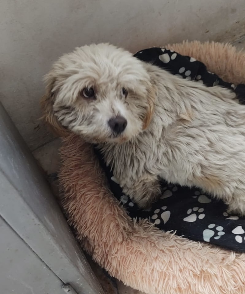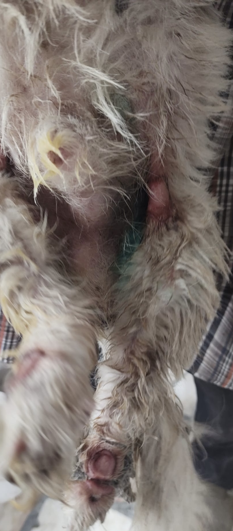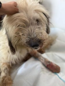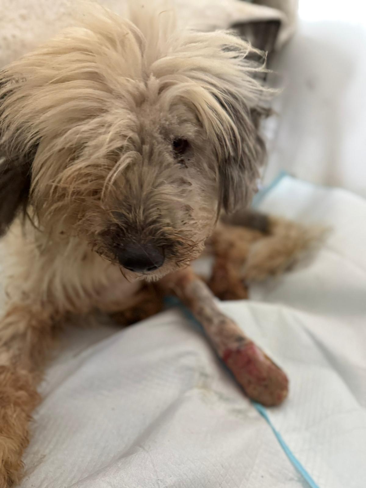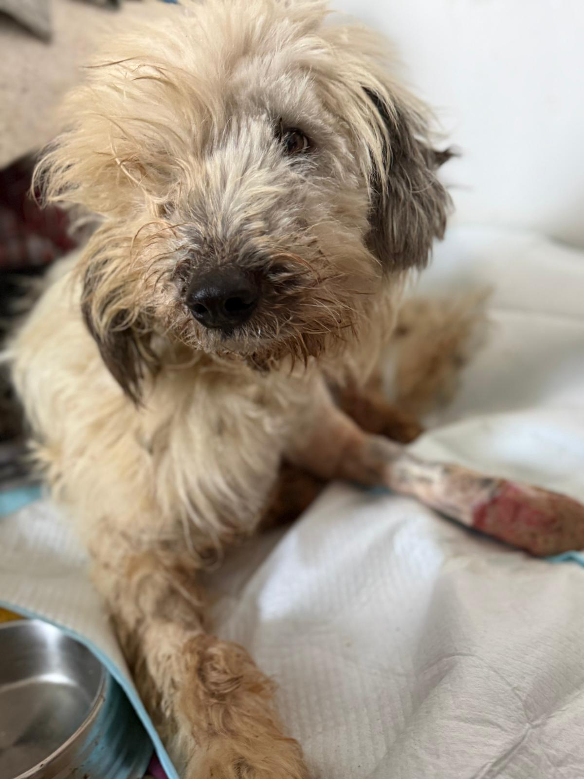 Auch diesen kleinen verletzten Rüden haben aufgenommen. Er wurde von einem Auto angefahren.