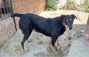 Die fast kahle Filia ist zu uns gekommen. Viel zu dünn. Wasser ist derzeit ein Riesenproblem für die Strassenhunde. Es ist heiss und viel zu trocken. Viele Hunde sterben derzeit, weil sie kein Wasser finden.