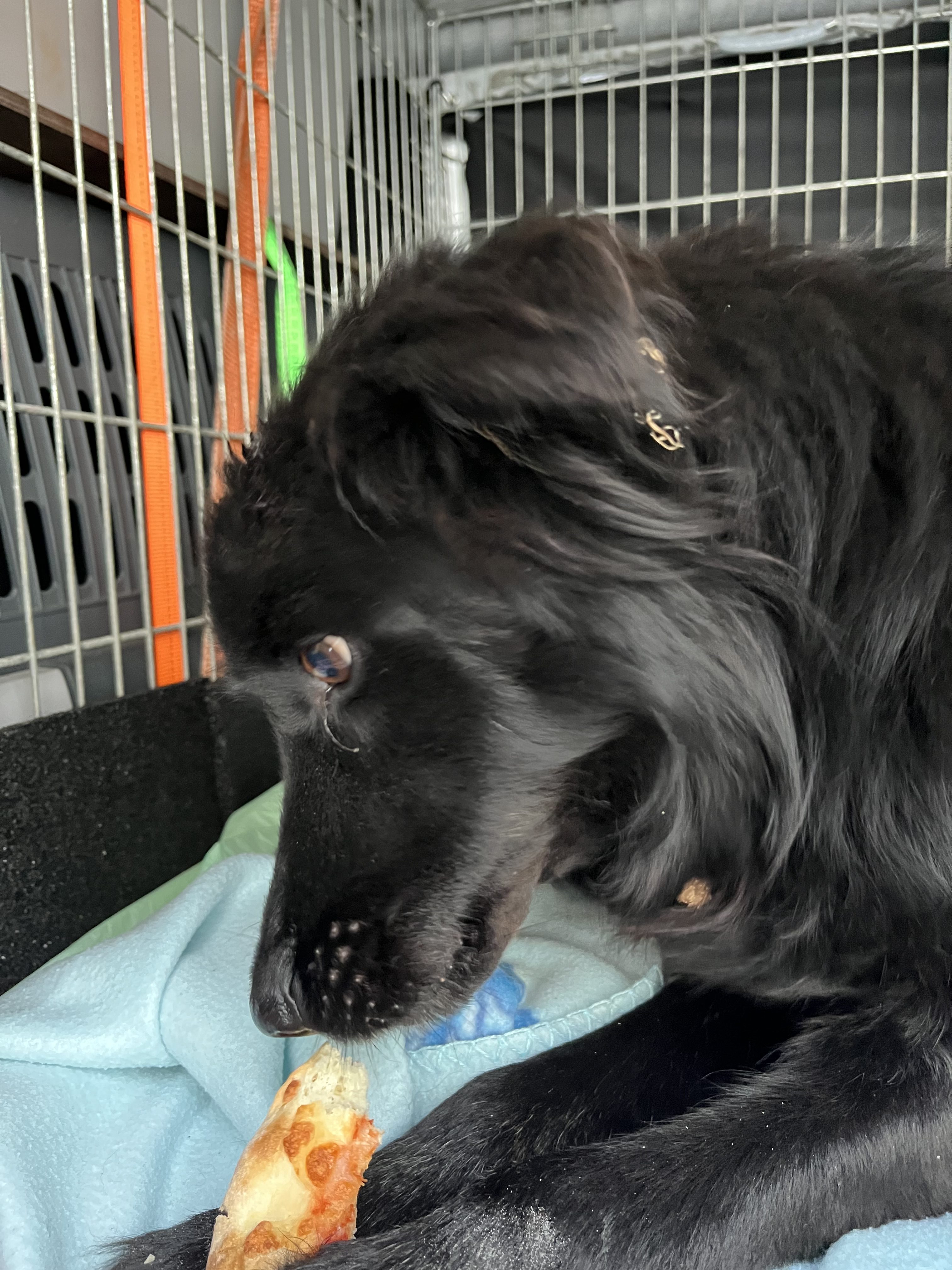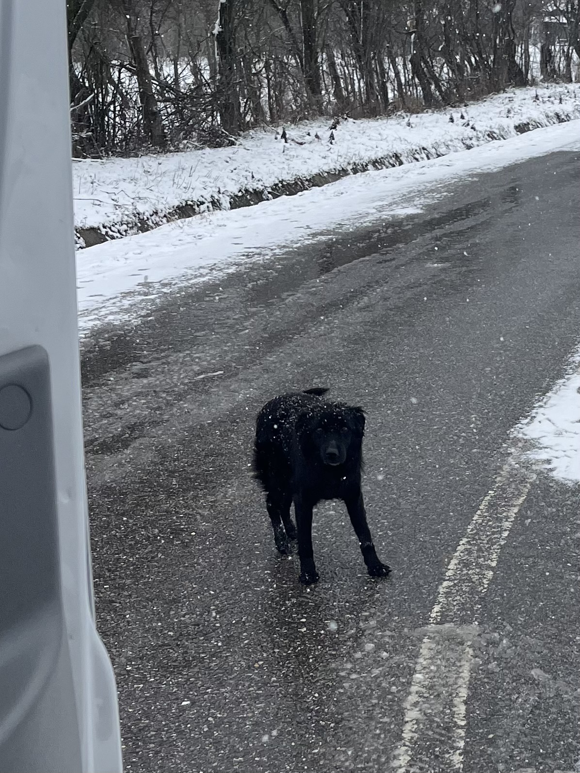 An einer Weggabelung sahen wir plötzlich einen schwarzen Hund ganz allein auf der Straße stehen, der sein rechtes Hinterbein nicht belastete. Wir hielten an und stellten fest, dass sein Bein stark verletzt war und vermuteten einen Autounfall. Er hatte keine offenen Wunde oder Bissverletzungen, aber konnte das Bein gar nicht belasten. Er war sehr freundlich und so nahmen wir ihn aus dem Nirgendwo mit. Unseren Reiseproviant – vegane Fleischwurstbrote- fand er auch klasse 😊.