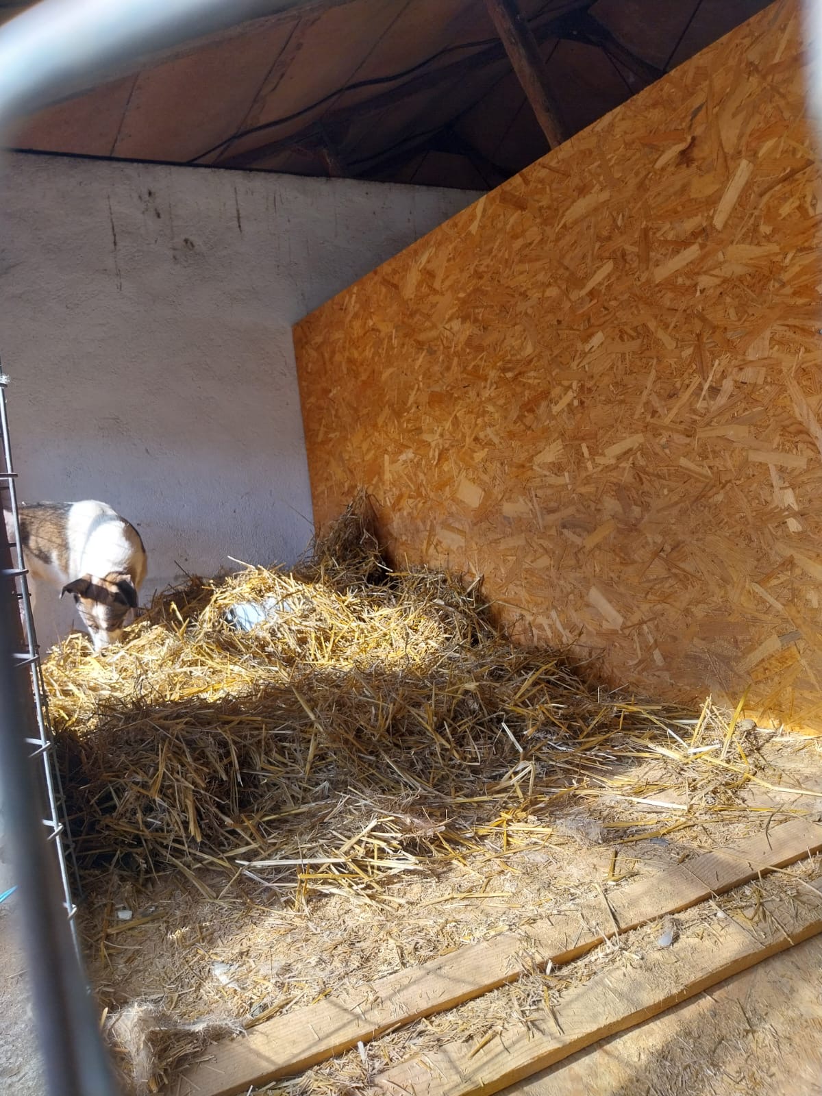 Wann immer es nötg ist, wird Stroh nachgelegt. Es wärmt und bringt auch Abwechslung für die Hunde 😊.